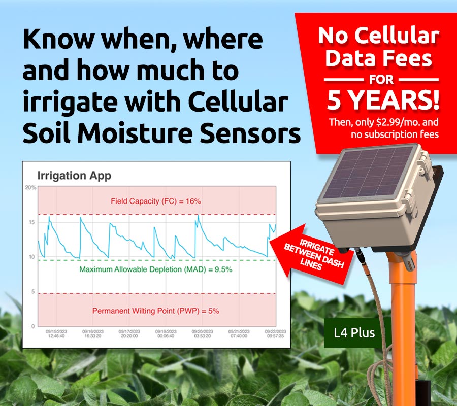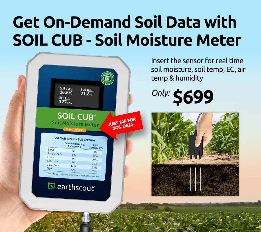 Save on pivot and drip irrigation costs with the EarthScout Irrigation App and Cellular Soil Moisture Sensors.