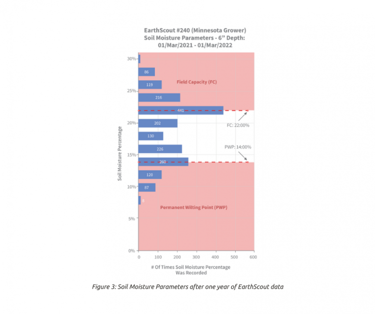In the case of the irrigated corn field described in Figure 2, which is a Loam, the field capacity could be estimated at between 20-24% after just two irrigation events were measured with the EarthScout. Using just the soil texture chart that estimate would be between 22- 28%.
