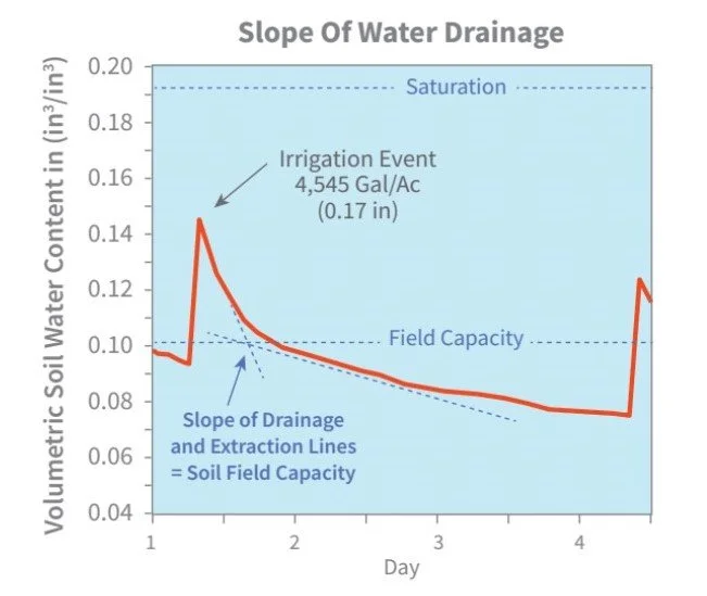 Once the EarthScout TDR sensor(s) is installed, you and your Grow Coach can use a couple of different methods to more accurately estimate the FC and PWP. The fastest, though least accurate method is to check the %Soil Moisture measurement 24-48hrs after a large rain or irrigation event. After a few wetting cycles and assuming that the water is moving above FC the measurements will align around the same value.