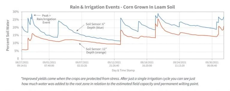 Larger peaks are where more water entered the root zone and smaller peaks show less water. When there is a smaller peak in the 12” deep sensor (orange line) that is because there was less water that moved through the upper root zone.